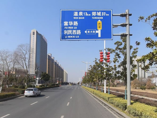 交通標(biāo)志桿橫臂的長度一般是跟標(biāo)志牌的長度相關(guān),一般情況下,標(biāo)志牌應(yīng)該懸掛于道路的正上方,在規(guī)劃懸臂長度時(shí)應(yīng)充分考慮交通標(biāo)志桿立桿的裝置方位,標(biāo)志牌前方可視范圍內(nèi)是否有花木和其他懸掛物遮擋駕駛員視野,是否立于綠化帶內(nèi)。歸納現(xiàn)場情況,來確認(rèn)交通標(biāo)志桿的橫臂長度。例如一塊長度為4m的標(biāo)志牌,立桿間隔綠化帶路沿2m,一般情況下,懸臂的長度應(yīng)規(guī)劃為6-8m。