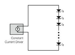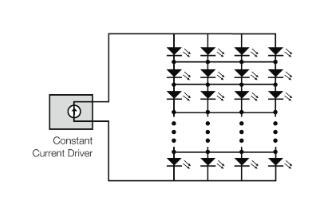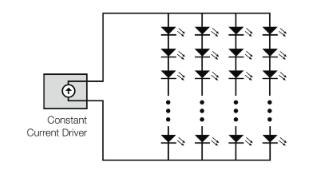 在串聯(lián)配置中,各個(gè)LED串聯(lián)布置。這樣做的優(yōu)點(diǎn)是,相同的電流經(jīng)過(guò)它們中的每一個(gè),導(dǎo)致發(fā)出的光亮度相同。另一個(gè)優(yōu)點(diǎn)是,如果一個(gè)LED在短路中出現(xiàn)故障,其他LED不受影響,仍然亮著。缺點(diǎn)是如果一個(gè)LED在開(kāi)路中出現(xiàn)故障,則電流將被中斷,其他所有LED都熄滅。另一個(gè)缺點(diǎn)是,如果需要許多LED來(lái)產(chǎn)生所需的光量,則正向電壓的總和可能需要使用相當(dāng)高的輸出電壓的電源。