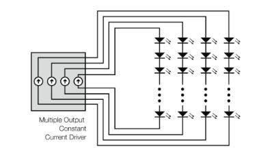 一些照明應(yīng)用可能只使用一個(gè)LED。這種使用的功率通常約為1W,正向電壓在2-3V的范圍內(nèi),正向電流約為350mA。雖然這會(huì)產(chǎn)生明亮的光源,但更可能的是,LED會(huì)被用于單個(gè)照明燈具或一組燈具中的某種陣列,以產(chǎn)生更明亮和更均勻的光源。LED通常用于四種配置中的一種配置。將LED串聯(lián)、并聯(lián)或矩陣(串聯(lián)和并聯(lián)組合)配置使其從單個(gè)電源驅(qū)動(dòng)。第四種配置使用多個(gè)通道,需要多個(gè)電源。
